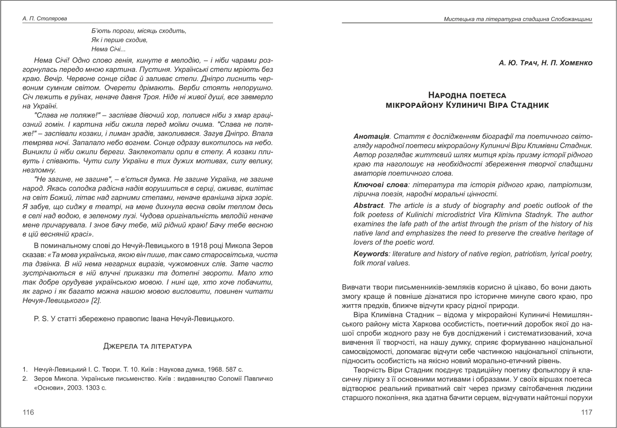 | Бібліографія: | Трач А. Ю., Хоменко Н. П. Народна поетеса мікрорайону Кулиничі Віра Стадник. Пам’яткознавчі студії дослідників XXI ст.: зб. наук. ст. Випуск VIII, Харків : Курсор, 2023. C. 117–122 , іл. |