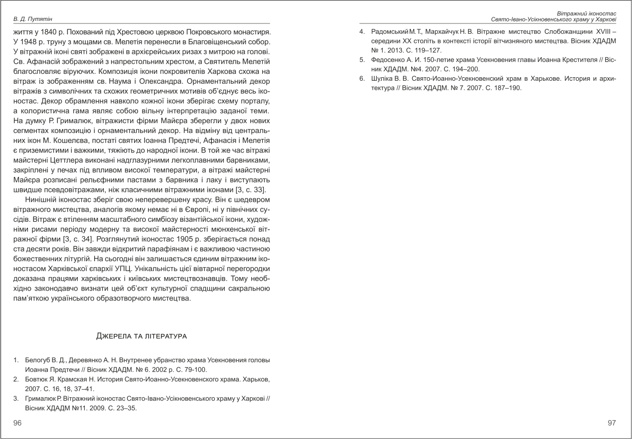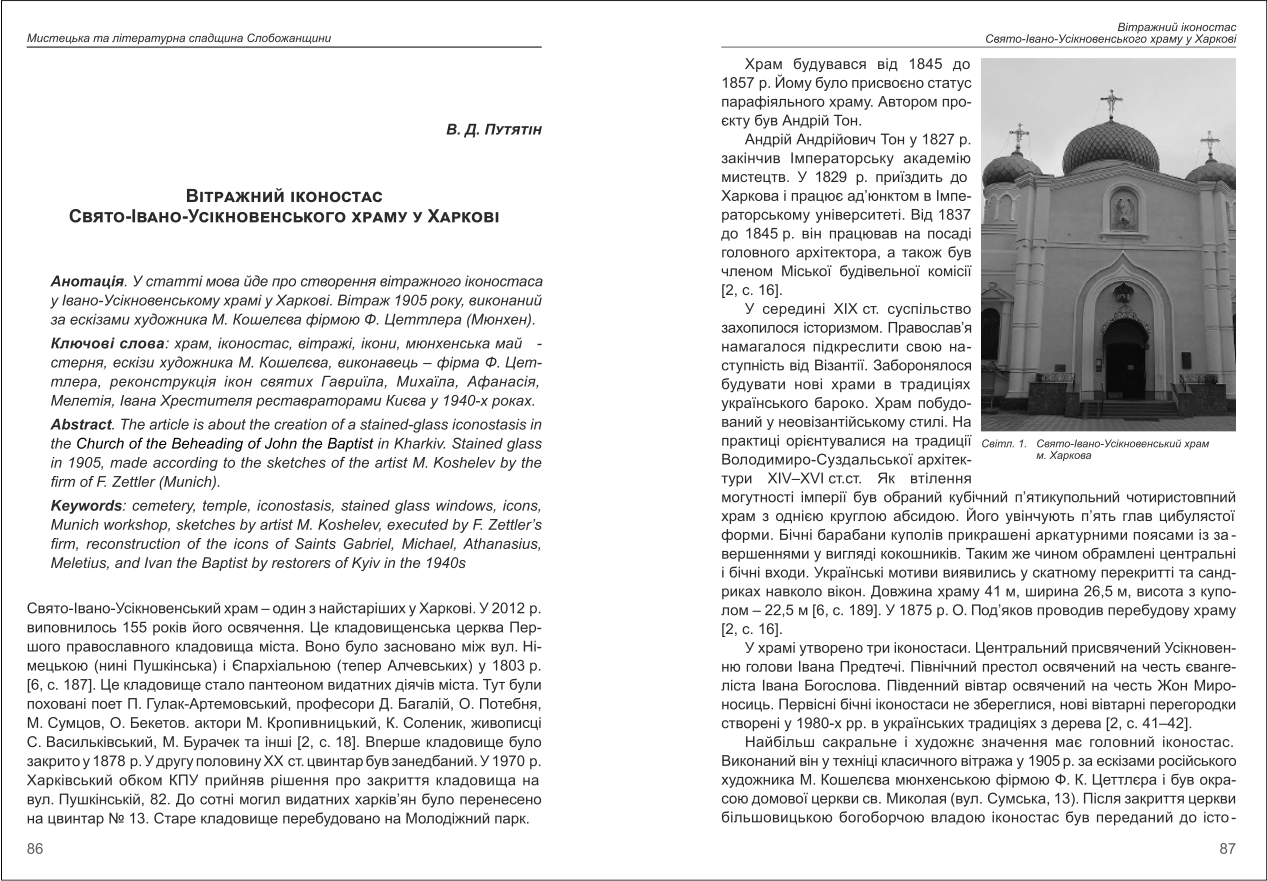 | Бібліографія: | Путятін В. Д. Вітражний іконостас Свято-Івано-Усікновенського храму у Харкові. Пам’яткознавчі студії дослідників XXI ст.: зб. наук. ст. Випуск VIII, Харків : Курсор, 2023. C. 86–97 , іл. |