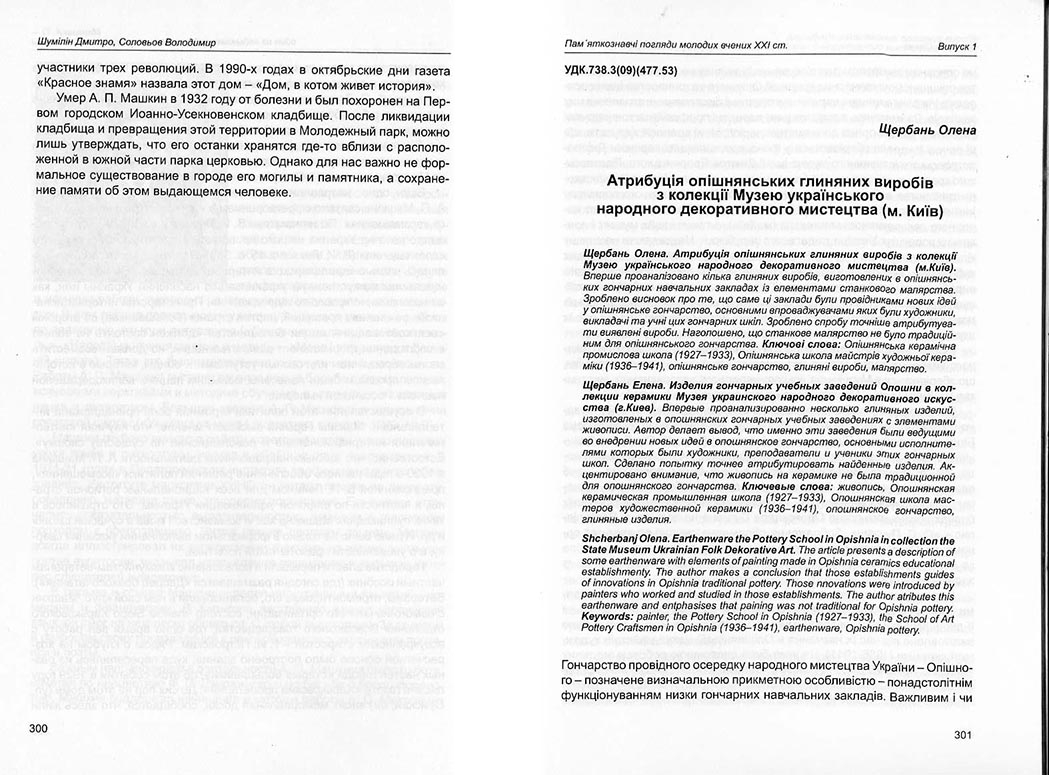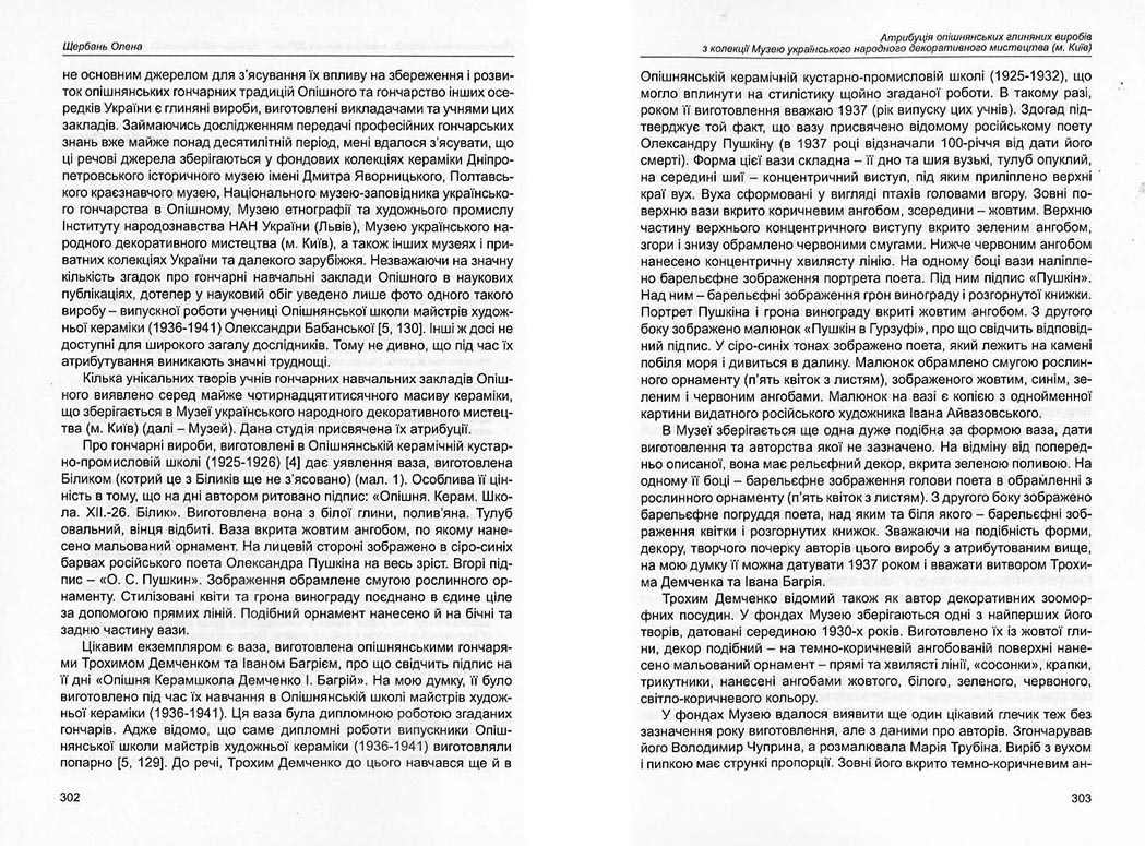 | Бібліографія: | Щербань О. В. Атрибуція опішнянських глиняних виробів з колекції Музею українського народного декоративного мистецтва (м. Київ). Пам'яткознавчі погляди молодих вчених XXI ст.: зб. наук. ст. Випуск I, Харків : Курсор, 2010. C. 301–307 |