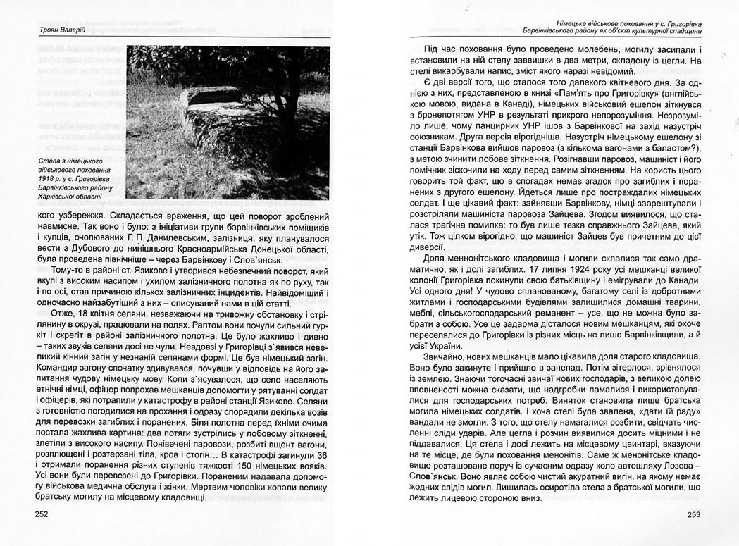 | Бібліографія: | Троян В. Ю. Німецьке військове поховання у с. Григорівка Барвінківського району як об'єкт культурної спадщини. Пам'яткознавчі погляди молодих вчених XXI ст.: зб. наук. ст. Випуск I, Харків : Курсор, 2010. C. 250–254 , іл. |