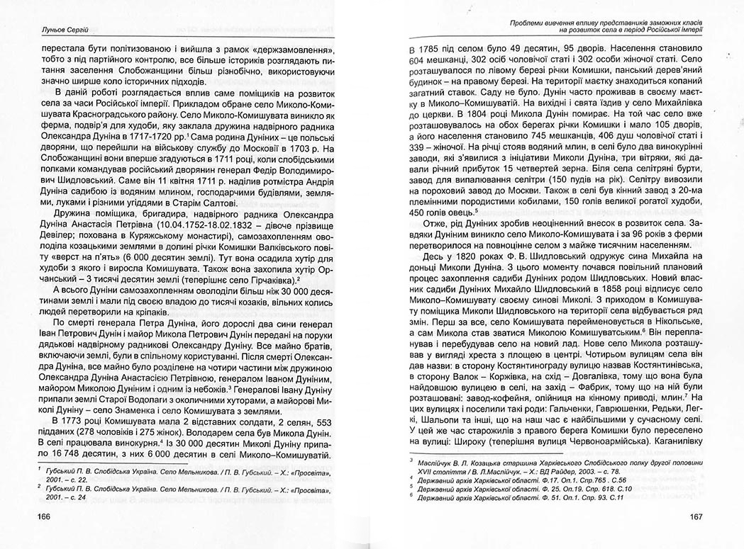 | Бібліографія: | Луньов С. М. Проблеми вивчення впливу представників заможних класів на розвиток села в період Російської імперії (на прикладі с. Миколо-Комишувата Красноградського району Харківської обл. Пам'яткознавчі погляди молодих вчених XXI ст.: зб. наук. ст. Випуск I, Харків : Курсор, 2010. C. 165–171 |