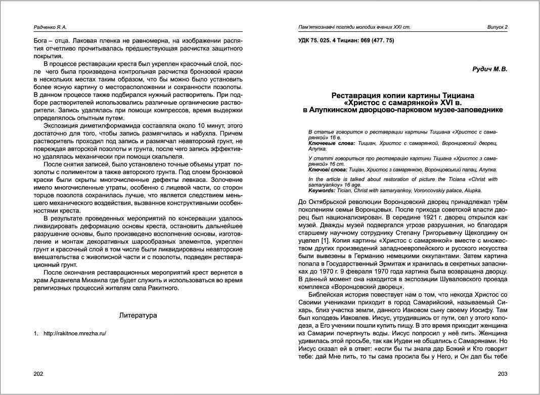| Бібліографія: | Рудич М. В. Реставрация копии картины Тициана "Христос с самарянкой" 16 в. В Алупкинском дворцово-парковом музее-заповеднике. Пам'яткознавчі погляди молодих вчених XXI ст.: зб. наук. ст. Випуск II, Харків : Курсор, 2011. C. 203–207 , іл. |
