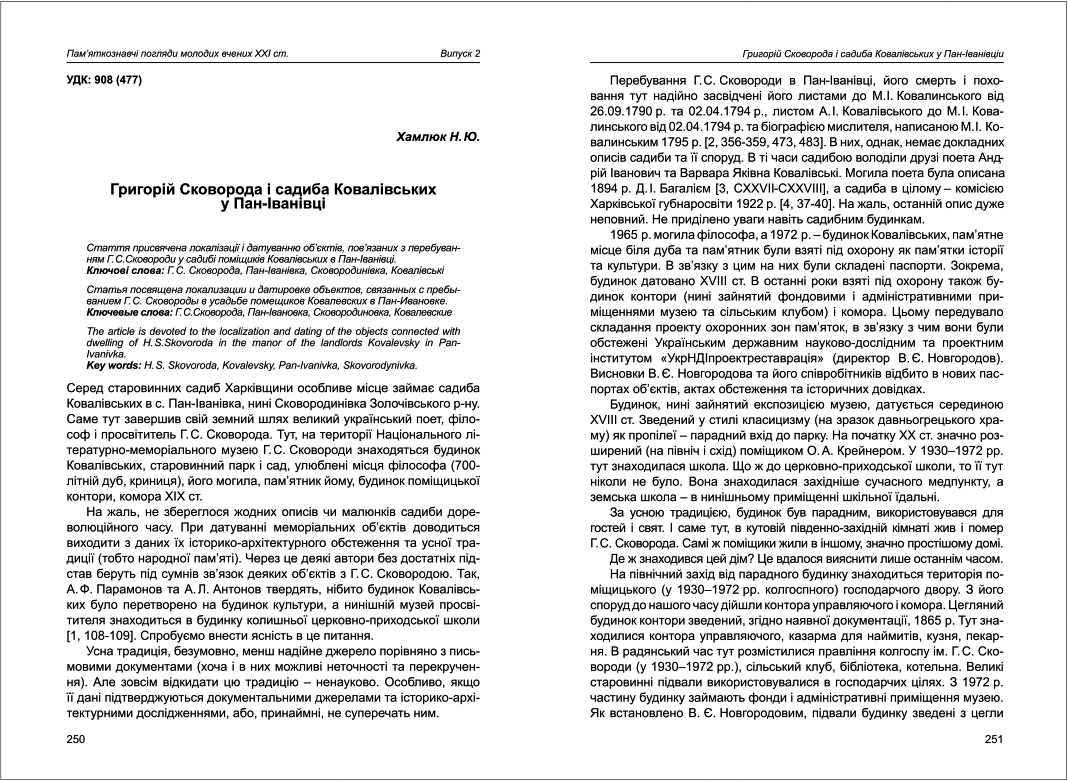 | Бібліографія: | Хамлюк Н. Ю. Григорій Сковорода і садиба Ковалівських у Пан-Іванівці. Пам'яткознавчі погляди молодих вчених XXI ст.: зб. наук. ст. Випуск II, Харків : Курсор, 2011. C. 250–253 |