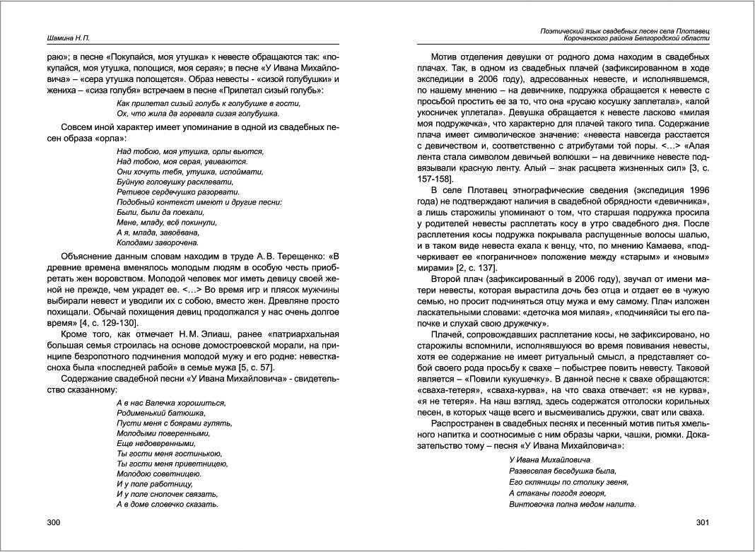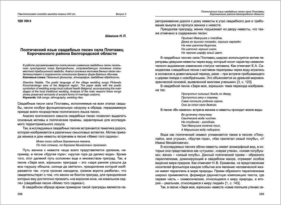 | Бібліографія: | Шаміна Н. П. Поэтический язык свадебных песен села Плотавец Корочанского района Белгородской области. Пам'яткознавчі погляди молодих вчених XXI ст.: зб. наук. ст. Випуск II, Харків : Курсор, 2011. C. 298–302 |