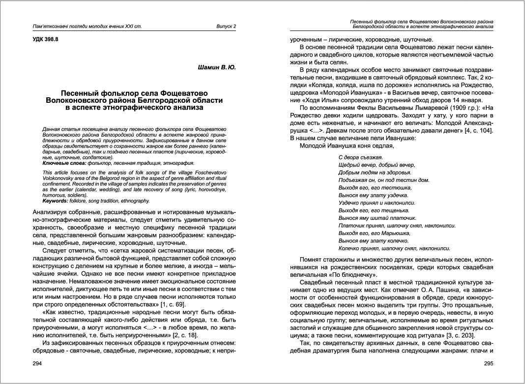 | Назва статті: | Песенный фольклор села Фощеватово Волоконовского района Белгородской области в аспекте этнографического анализа |