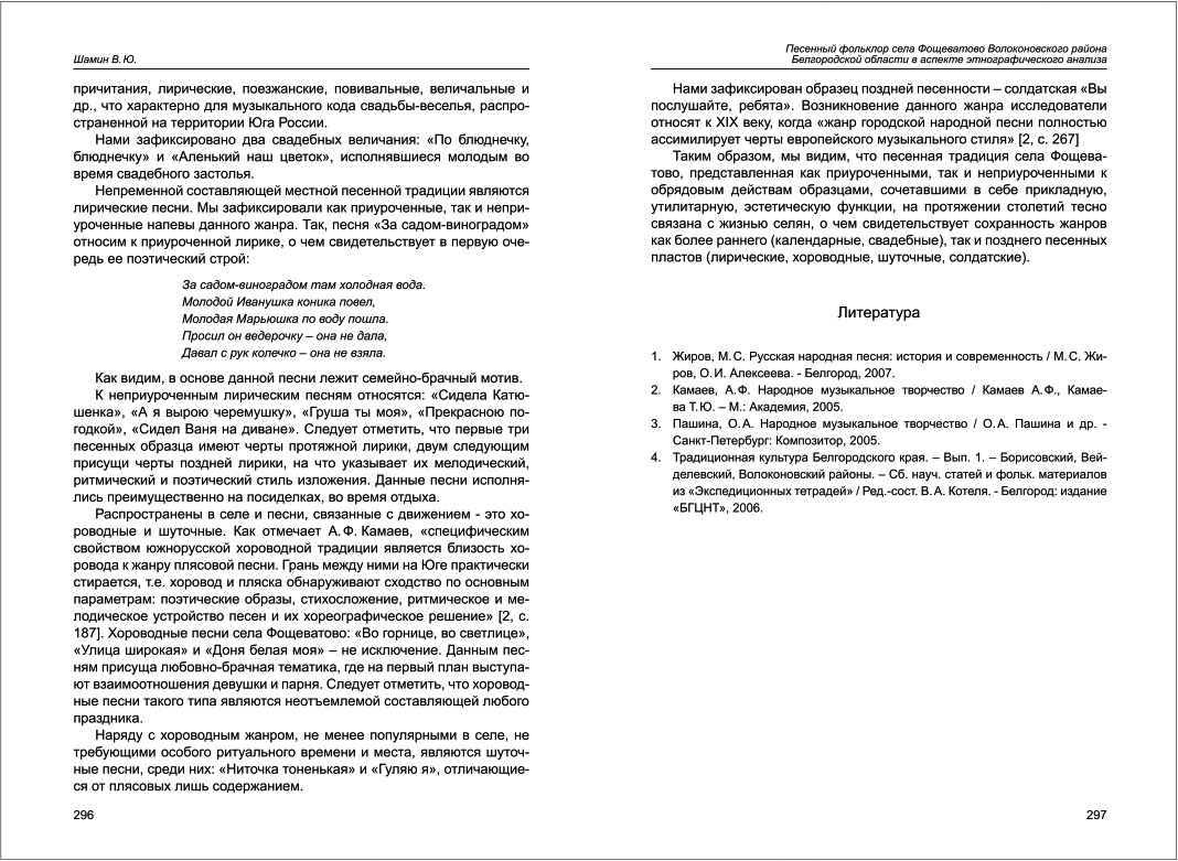 | Бібліографія: | Шамін В. Ю. Песенный фольклор села Фощеватово Волоконовского района Белгородской области в аспекте этнографического анализа. Пам'яткознавчі погляди молодих вчених XXI ст.: зб. наук. ст. Випуск II, Харків : Курсор, 2011. C. 294–297 |