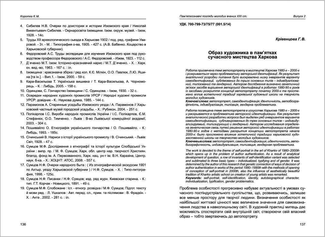 | Бібліографія: | Крівенцова Г. В. Образ художника в пам'ятках сучасного мистецтва Харкова. Пам'яткознавчі погляди молодих вчених XXI ст.: зб. наук. ст. Випуск II, Харків : Курсор, 2011. C. 137–142 |