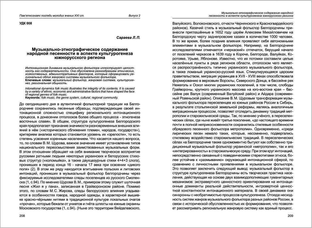 | Бібліографія: | Сараєва Л. П. Музыкально-этнографическое содержание народной песенности в аспекте культурогенеза южнорусского региона. Пам'яткознавчі погляди молодих вчених XXI ст.: зб. наук. ст. Випуск II, Харків : Курсор, 2011. C. 208–212 |
