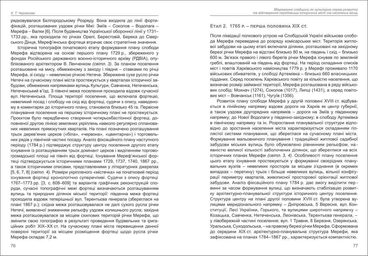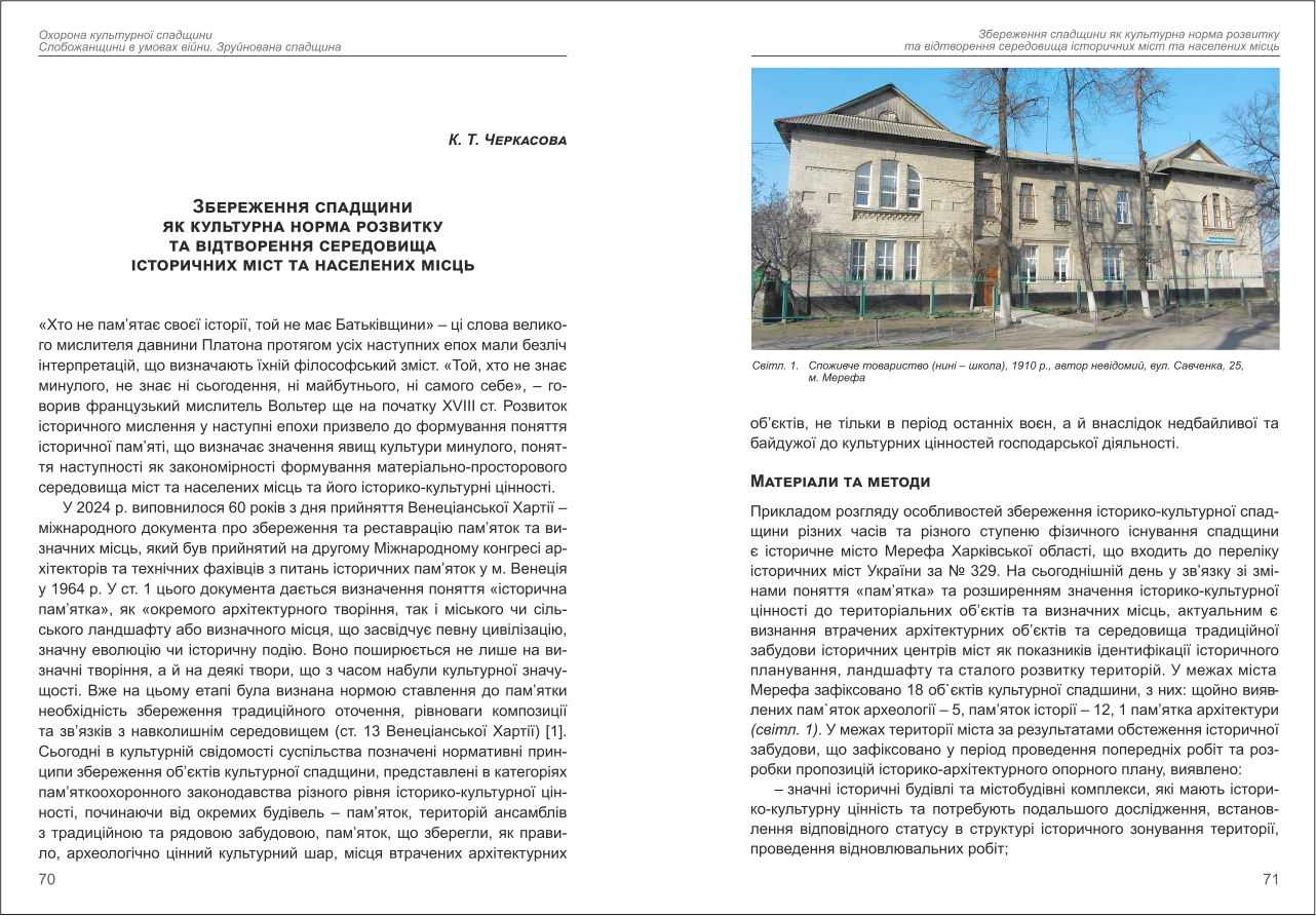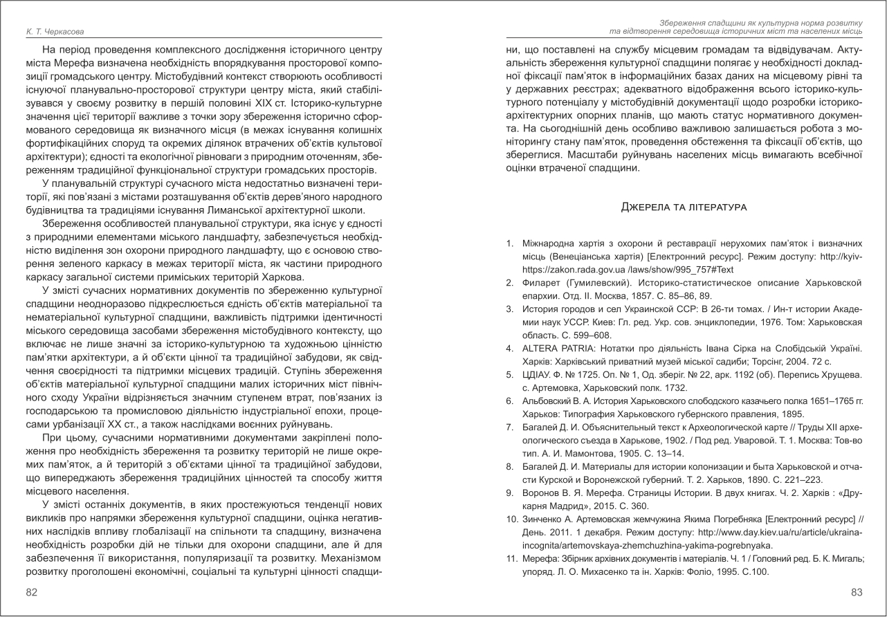 | Бібліографія: | Черкасова К. Т. Збереження спадщини як культурна норма розвитку та відтворення середовища історичних міст та населених місць. Культурна спадщина Слобожанщини: зб. наук. ст. Число 55, Харків : Курсор, 2024. C. 70–83 , іл. |