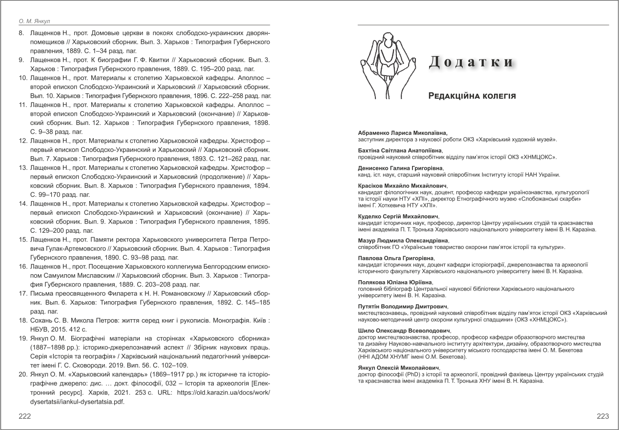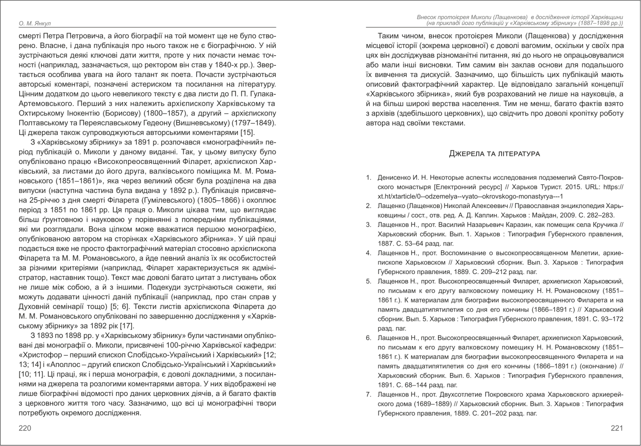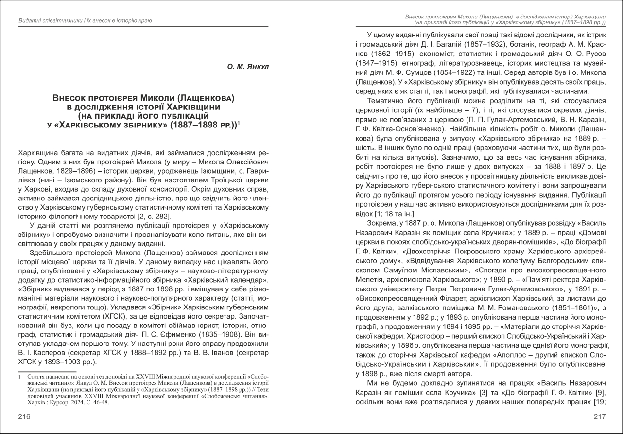 | Бібліографія: | Янкул О. М. Внесок протоієрея Миколи (Лащенкова) в дослідження історії Харківщини (на прикладі його публікацій у «Харківському збірнику» (1887–1898 рр.)). Культурна спадщина Слобожанщини: зб. наук. ст. Число 55, Харків : Курсор, 2024. C. 216–222 |