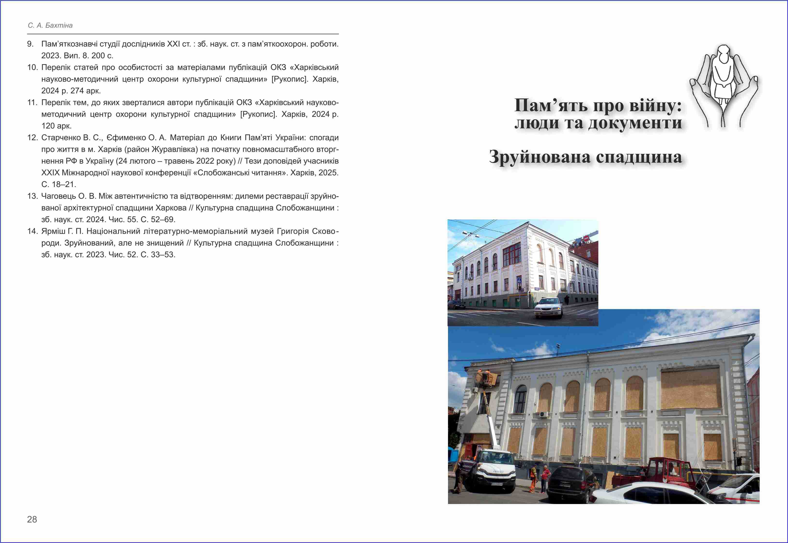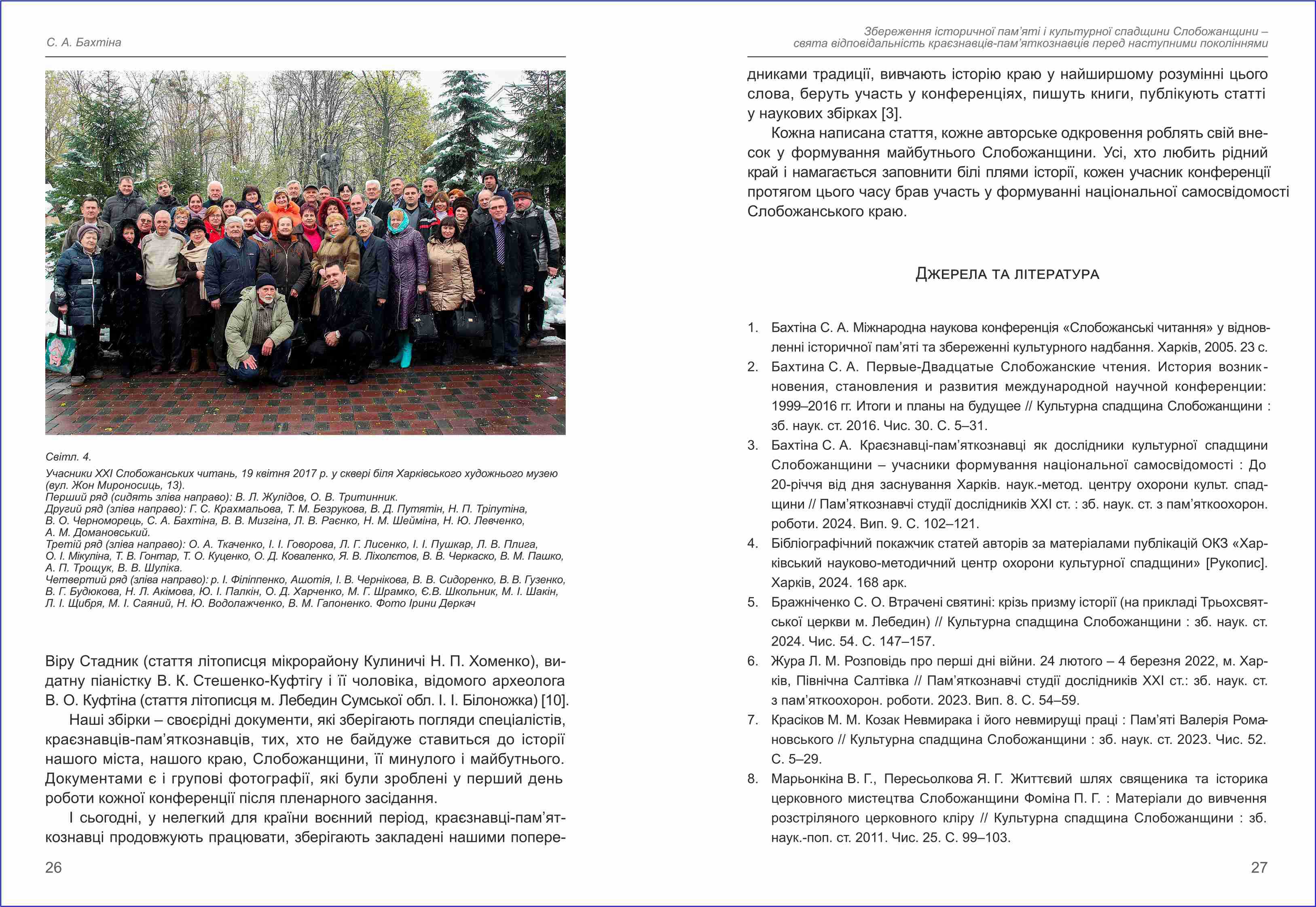 | Бібліографія: | Бахтіна С. А. Збереження історичної пам’яті і культурної спадщини Слобожанщини – свята відповідальність краєзнавців-пам’яткознавців перед наступними поколіннями 19. Культурна спадщина Слобожанщини: зб. наук. ст. Число 57, Харків : Курсор, 2025. C. 19–28 , іл. |