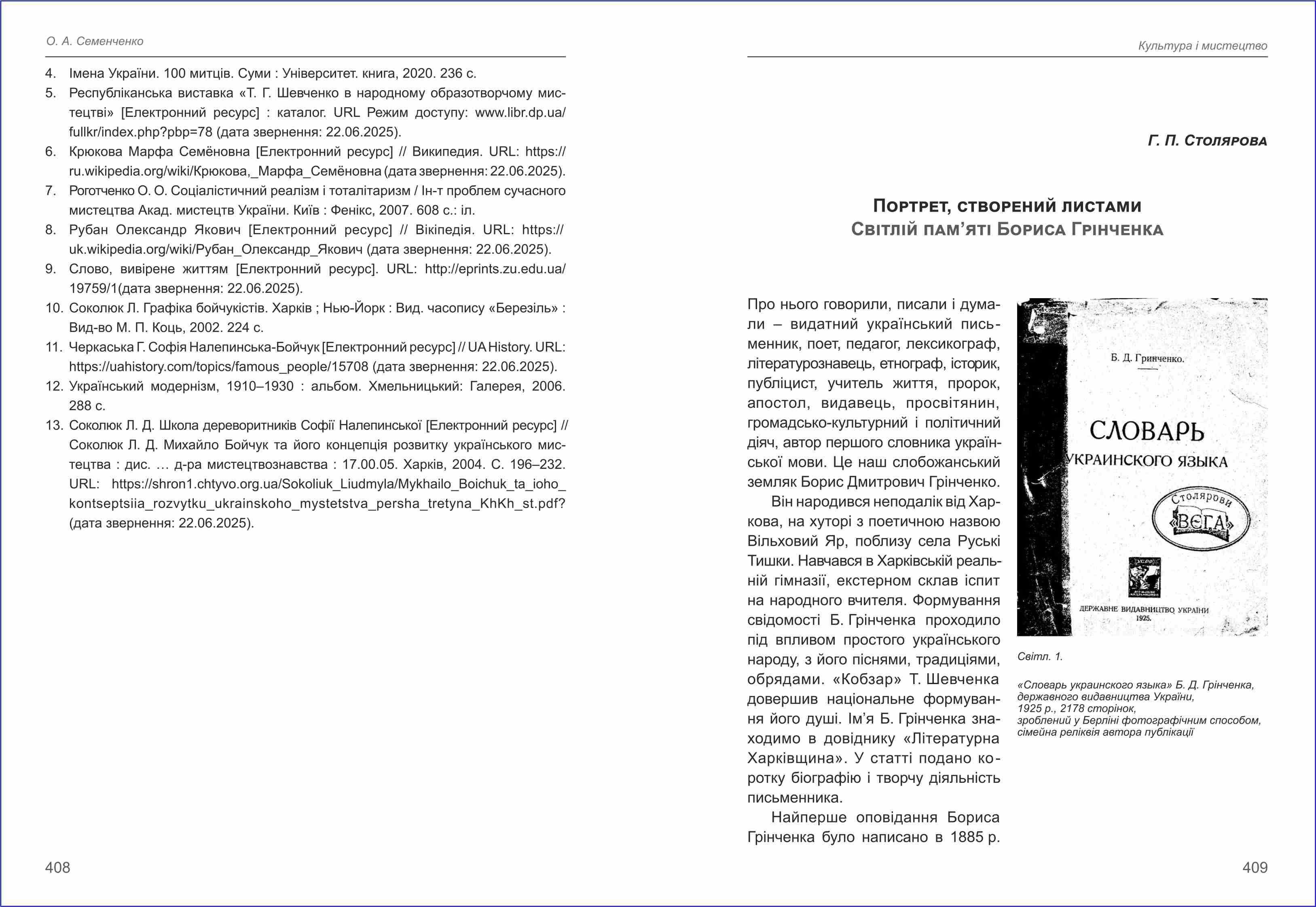 | Бібліографія: | Столярова Г. П. Портрет, створений листами. Світлій пам’яті Бориса Грінченка . Культурна спадщина Слобожанщини: зб. наук. ст. Число 57, Харків : Курсор, 2025. C. 409–414 , іл. |