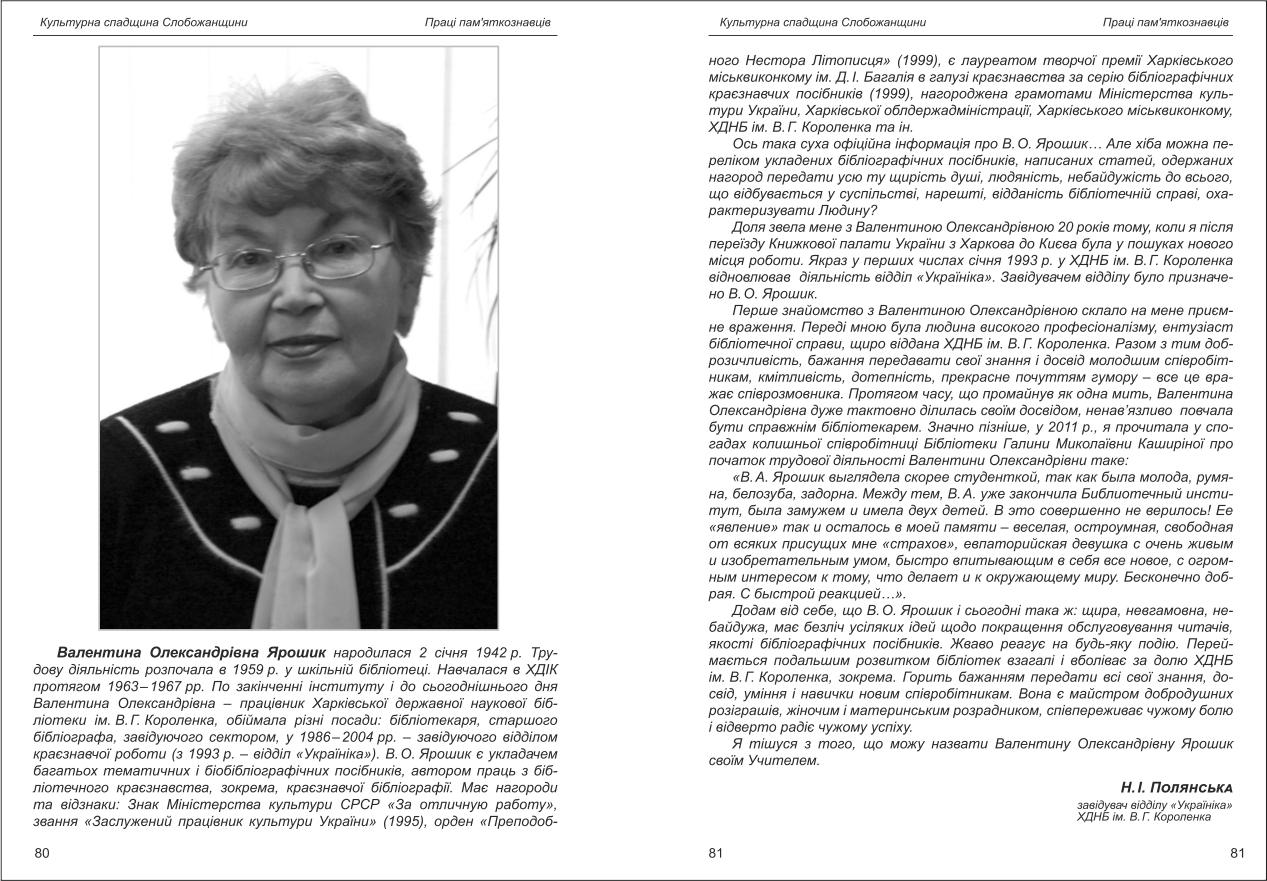 Полянська: До 70-річчя з дня народження. Ярошик Валентина Олександрівна