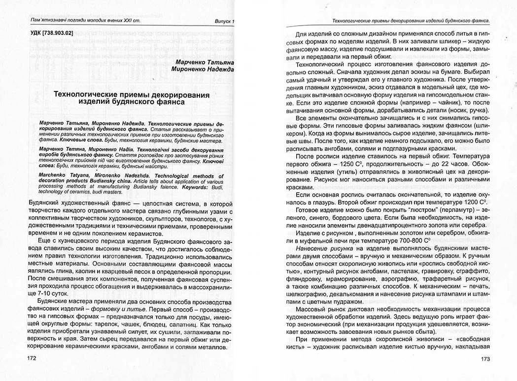Бабкіна Д. В., Марченко Т. Л. Технологические приемы декорирования изделий будянского фаянса