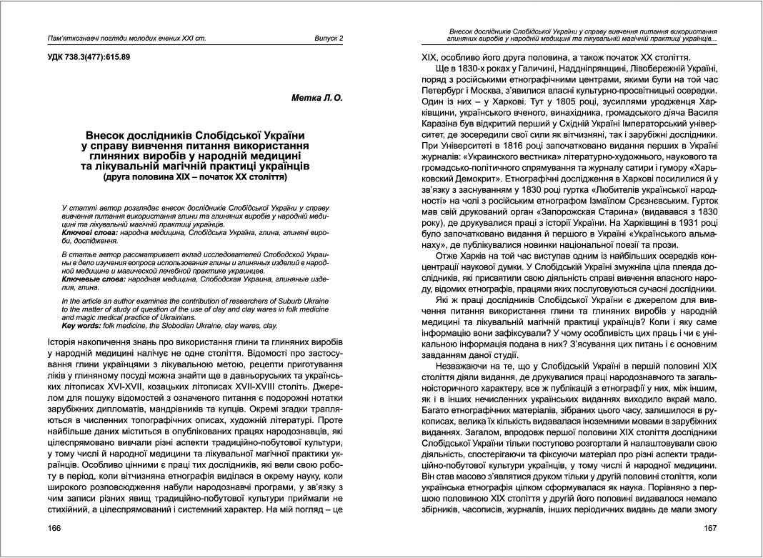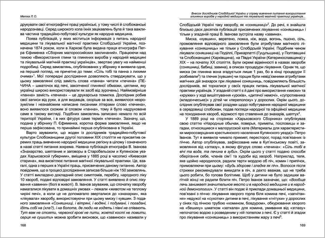 Метка Л. О. Внесок дослідників Слобідської України у справу вивчення питання використання глиняних виробів у народній медицині та лікувальній магічній практиці українців (друга половина 19 - початок 20 століття)